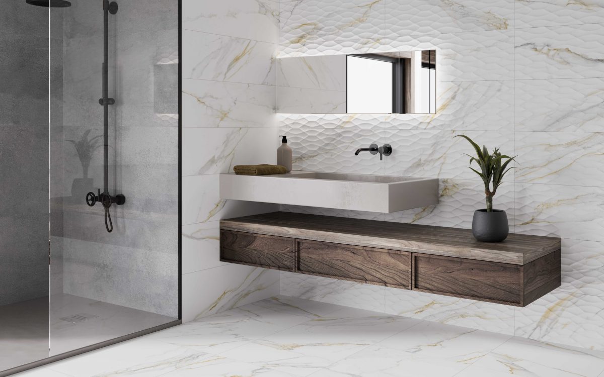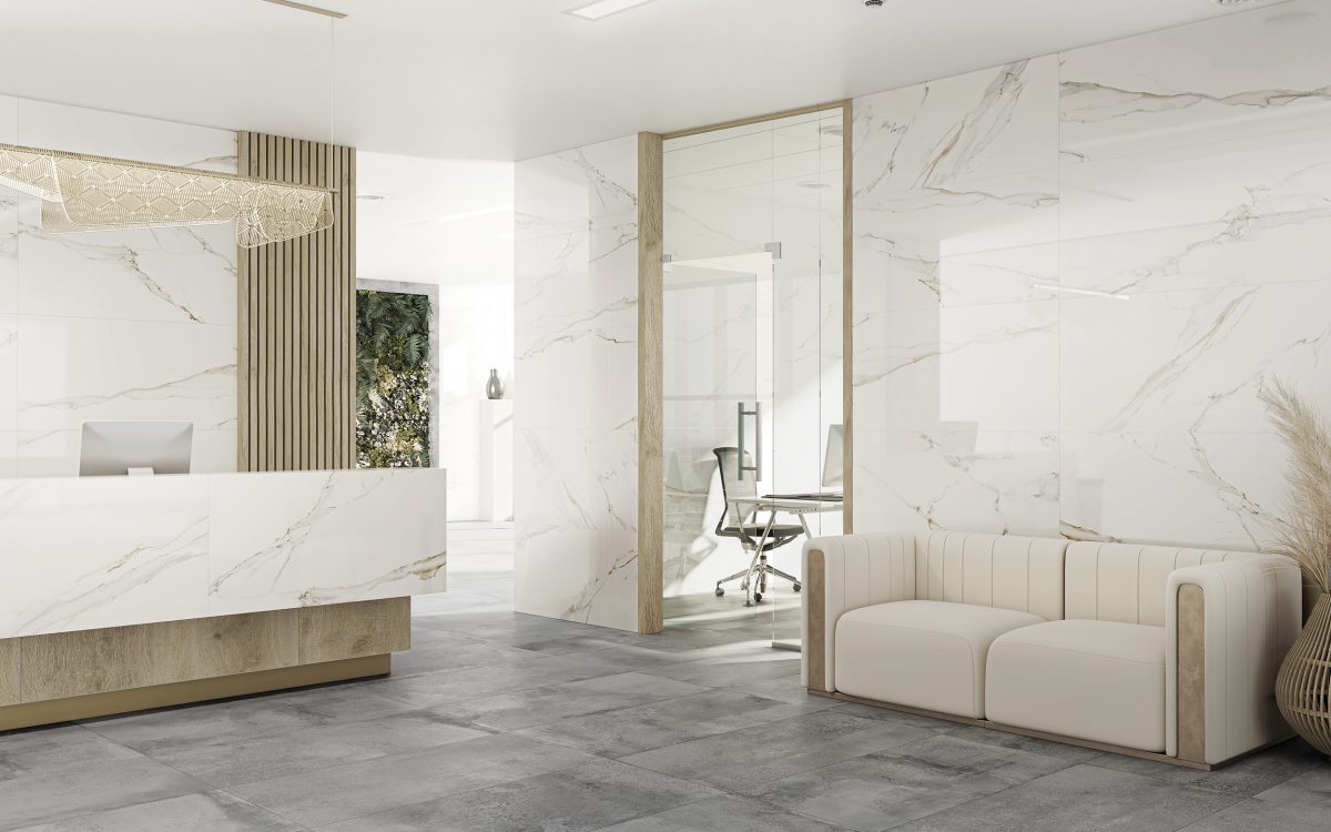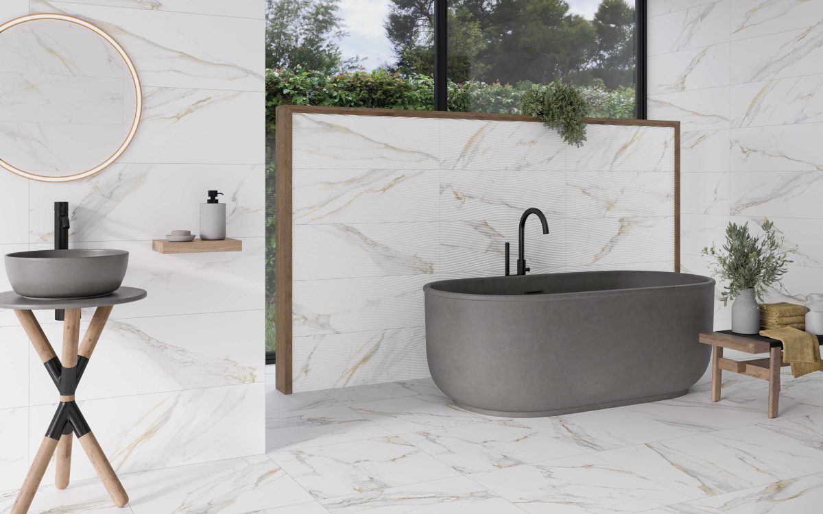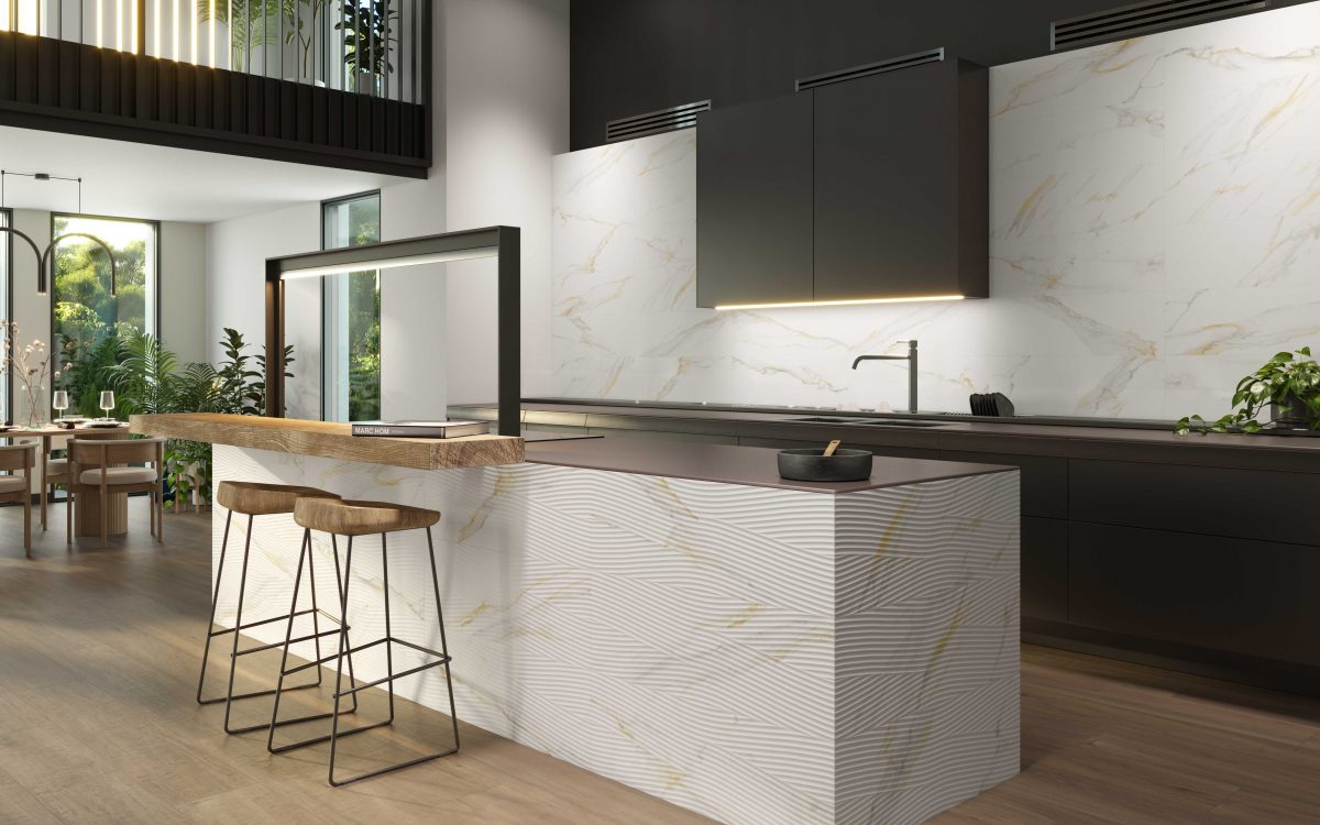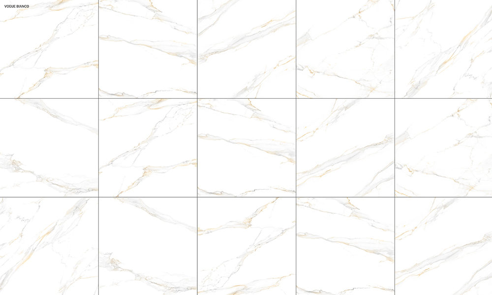 Vogue Bianco is a collection of Calacatta Gold marble characterised by a soft graphic intensity, a singular chromaticism in which light grey and gold veins merge on a pure white surface. A combination of naturalness and light, perfect for the avant-garde designs of today’s sector.
